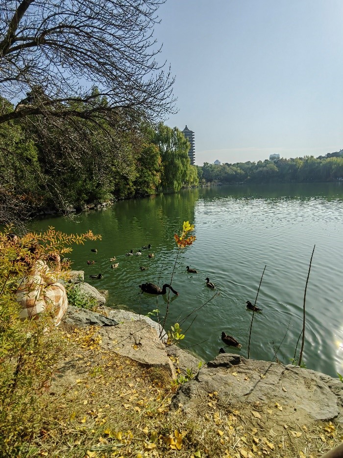 走到未名湖的东北角,发现这里聚集了一群野鸭,还有一只黑天鹅。原来是有人在岸边喂食。温暖的阳光撒在湖水上,波光粼粼中黑天鹅优雅地低下它长长的脖颈“亲吻”着湖面。