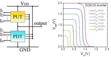 作为数字集成电路的主流逻辑形式,互补金属氧化物半导体(CMOS)逻辑架构为硅集成电路技术的发展和繁荣做出了重要贡献。CMOS逻辑门包含一个由空穴型场效应晶体管(p-FET)组成的上拉网络和一个由电子型晶体管(n-FET)组成的互补下拉网络。与其他类型的逻辑类型相比,CMOS电路具有高噪声容限和低功耗优势,因而被广泛的应用于数字集成电路中。近来,研究人员试图采用具有更高迁移率的半导体来构建新型晶体管,从而推进未来集成电路的发展。然而,比硅更高的载流子迁移率的半导体材料(例如砷化铟、锗、碳纳米管等)通常具有更小的带隙,其场效应晶体管会遭受严重的栅致漏极漏电流效应,致使CMOS逻辑门容易出现漏电流高、电压损耗大等现象,严重阻碍了这些半导体在超大规模集成电路中的应用。因此,有必要针对性的开发出一种新的逻辑形式,以推动高性能、高噪声容限和低功耗的窄带隙半导体集成电路发展。