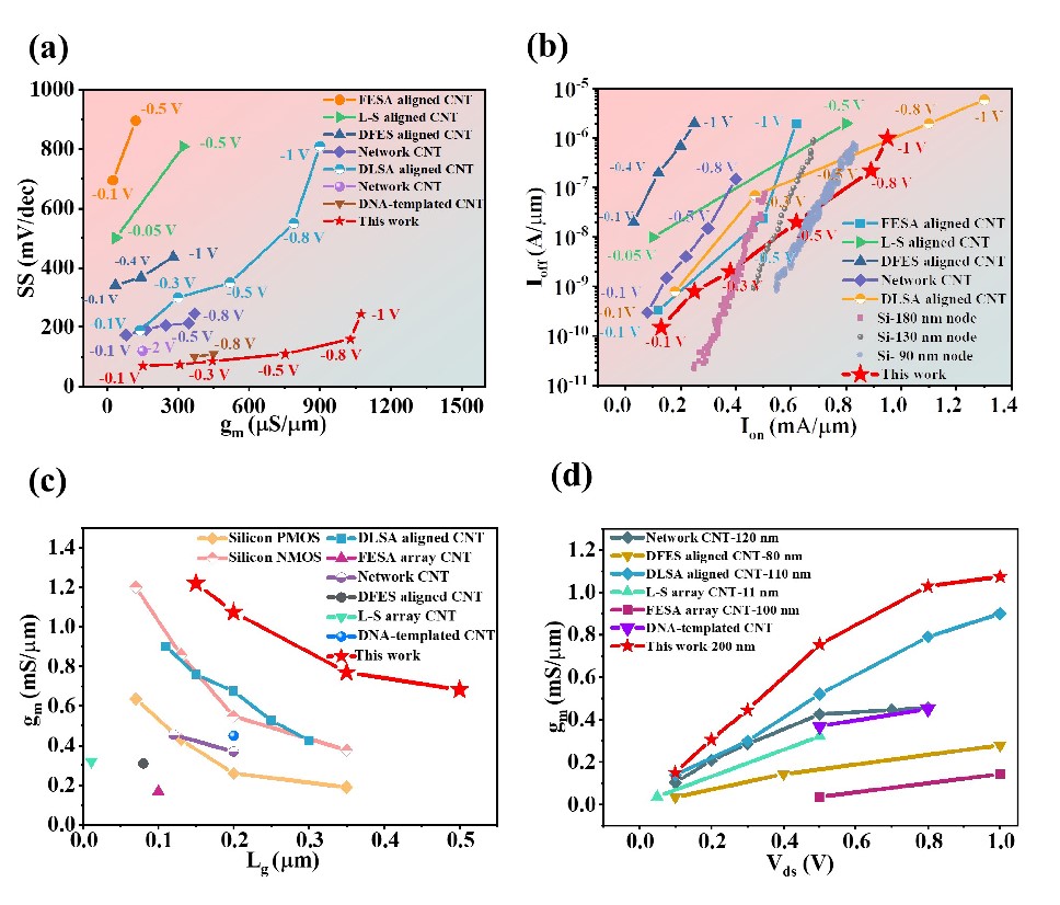 电子学系碳基电子学研究中心、纳米器件物理与化学教育部重点实验室张志勇-彭练矛联合课题组一直从事高性能碳纳米管晶体管和集成电路制备的研究。从材料开始突破,前期发展了全新的提纯和自组装方法,制备出高密度、高纯半导体阵列碳纳米管材料,在4英寸基底上制备出密度为120 /μm、半导体纯度高达99.99995%的碳管阵列(Science 368, 850-856, 2020),从而达到超大规模碳管集成电路的需求,突破了长期以来阻碍碳管电子学发展的瓶颈,首次在实验上显示出碳管器件和集成电路较传统技术的性能优势,为推进碳基集成电路的实用化发展奠定了基础。并且在此基础上,首次实现了有望在太赫兹频段工作的碳纳米管射频晶体管和高性能放大器,充分展现了碳管在射频电子学上的优势和潜力(Nature Electronics 4, 405-410, 2021)。虽然目前碳纳米管阵列材料已经制备出高性能的晶体管和电路,但是由于在材料、器件结构以及工艺过程等方面缺少系统的优化,制备的空穴型场效应晶体管(p-FET)通常为耗尽型(即阈值电压为正值,在零栅压时仍有足够大的导电能力),亚阈值斜率摆幅(SS)远大于100 mV/dec,这些问题会给构建碳基集成电路带来较大困难,并大幅度增加电路的功耗。因此,基于高密度半导体碳纳米管阵列构建高性能增强型晶体管,成为发展碳基电子学所必须的关键技术。