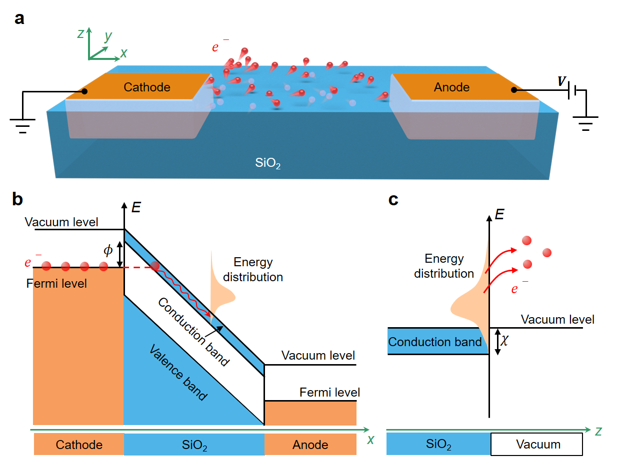 图1. 氧化硅隧穿二极管电子源的结构示意图(a)和能带图(b-c)