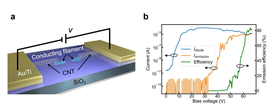 图2. 基于Si-SiO2-Si水平隧穿结的器件结构示意图(a)和电子发射性能(b)
