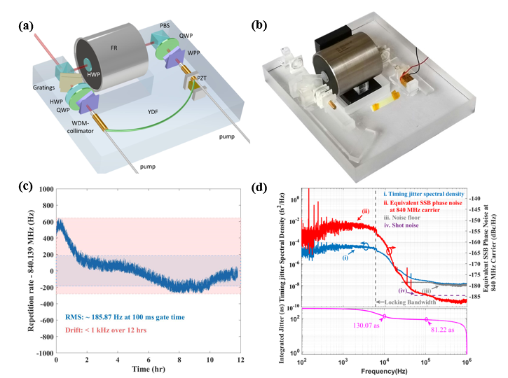 图2. (a) 固态光纤激光器结构设计;(b)激光器做在玻璃上:固态光纤激光器照片;(c)自由运转状态下12小时激光器重复频率的漂移; (d) 激光器时间抖动噪声功率谱和时间抖动积分。