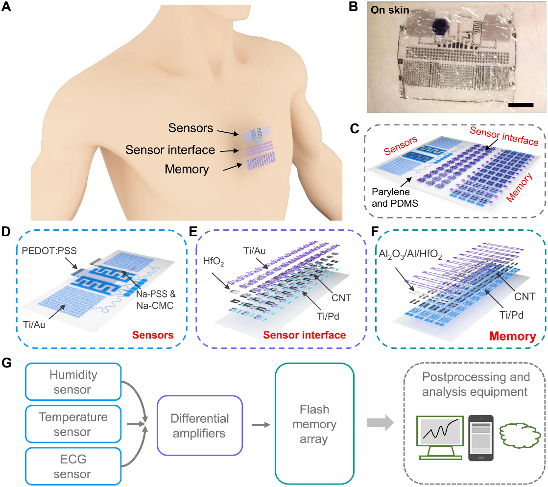 课题组充分利用碳纳米管材料能够实现晶圆级大批量加工的优势,在超薄的柔性基底上构建了多种基本电子元器件,并完成器件集成。所构建的差分放大电路能够实现超过27dB的增益,43dB的共模抑制比和22KHz的增益带宽积。基于超薄柔性电路,课题组展示了对于心电信号、湿度信号和温度信号的放大功能,并通过所构造的柔性存储器实现了对这些生理特征的存储。