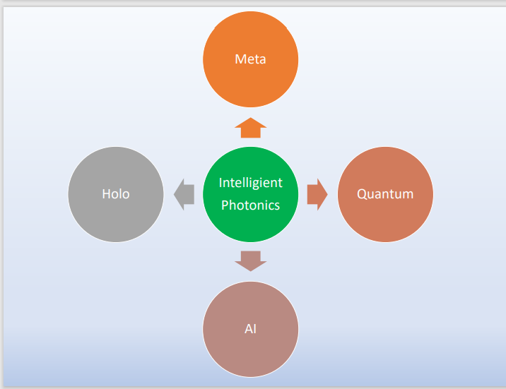 接下来,曹老师从元宇宙、人工智能、全息成像与量子信息四个角度展开讲述智能光子技术在科学研究与产业转化中的应用。首先介绍了元宇宙在现代信息社会中的应用,并展示了相关企业的产品。随后,曹老师从动态高分辨率计算全息显示的关键技术出发,结合团队多年的研究成果,提出传统全息技术、成像技术与人工智能算法、超表面和多维复用器件结合的研究思路。