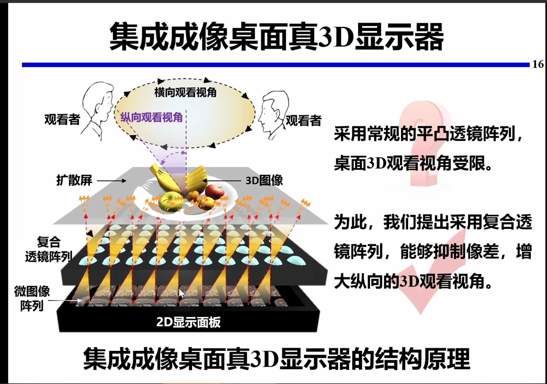 这部分的最后,王教授分享了自己研究组设计的集成桌面真3D显示器,通过对微透镜阵列的特殊设计,抑制了复合透镜像差,扩大了纵向观察角度。