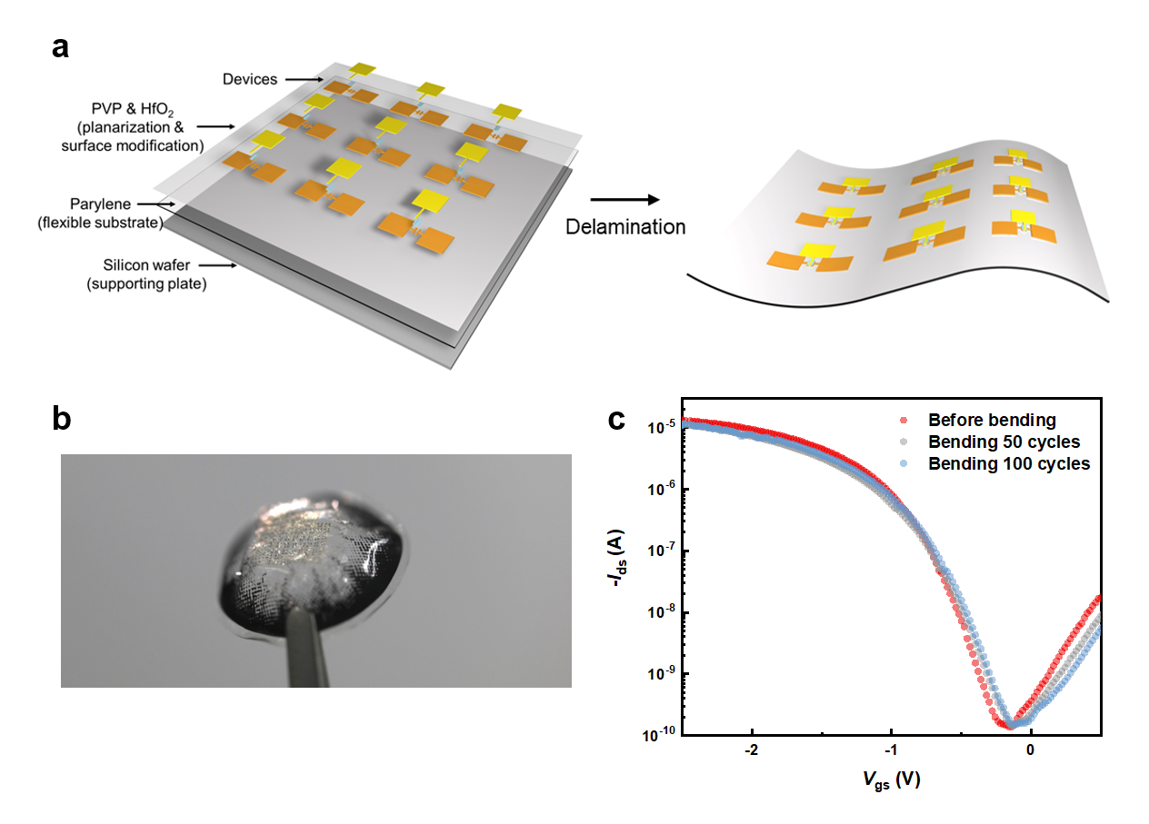 图1.a)柔性器件与电路加工流程示意图;b)柔性器件与电路被放置在隐形眼镜表面;c)器件的弯折测试中器件转移特性图