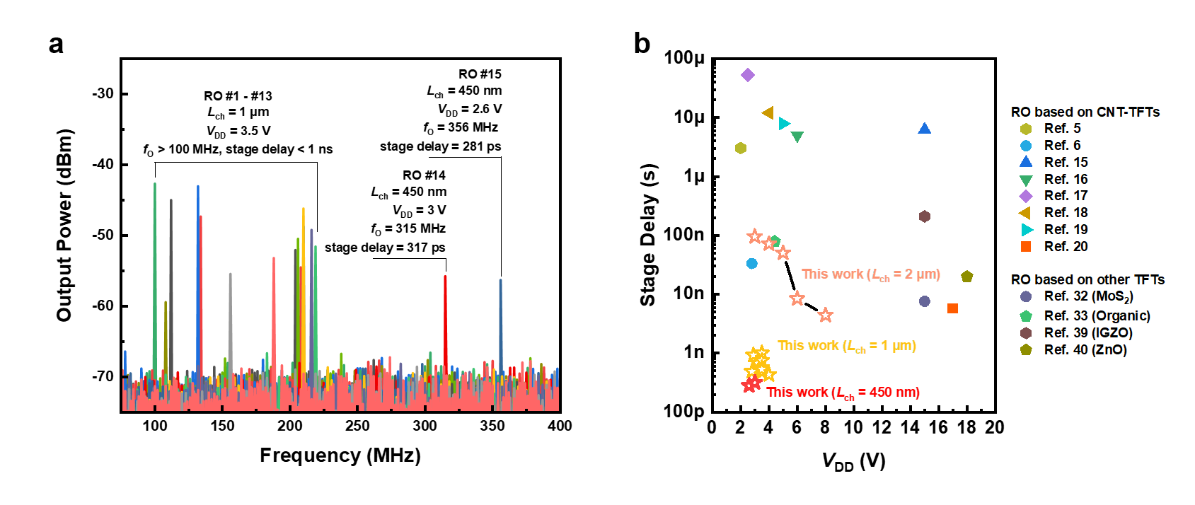 图2. a)亚纳秒延时的环形振荡器输出频谱图;b)基于各种材料体系的柔性环形振荡器对比