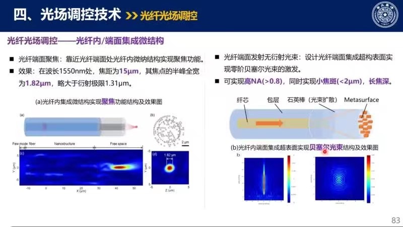 随后柳教授讲述了光纤光场调控技术的应用,包括在光纤内集成微结构实现聚焦功能以及在光线内端面集成超表面实现贝塞尔光束的应用,并基于此展示了两种应用的聚焦结构与良好的效果。