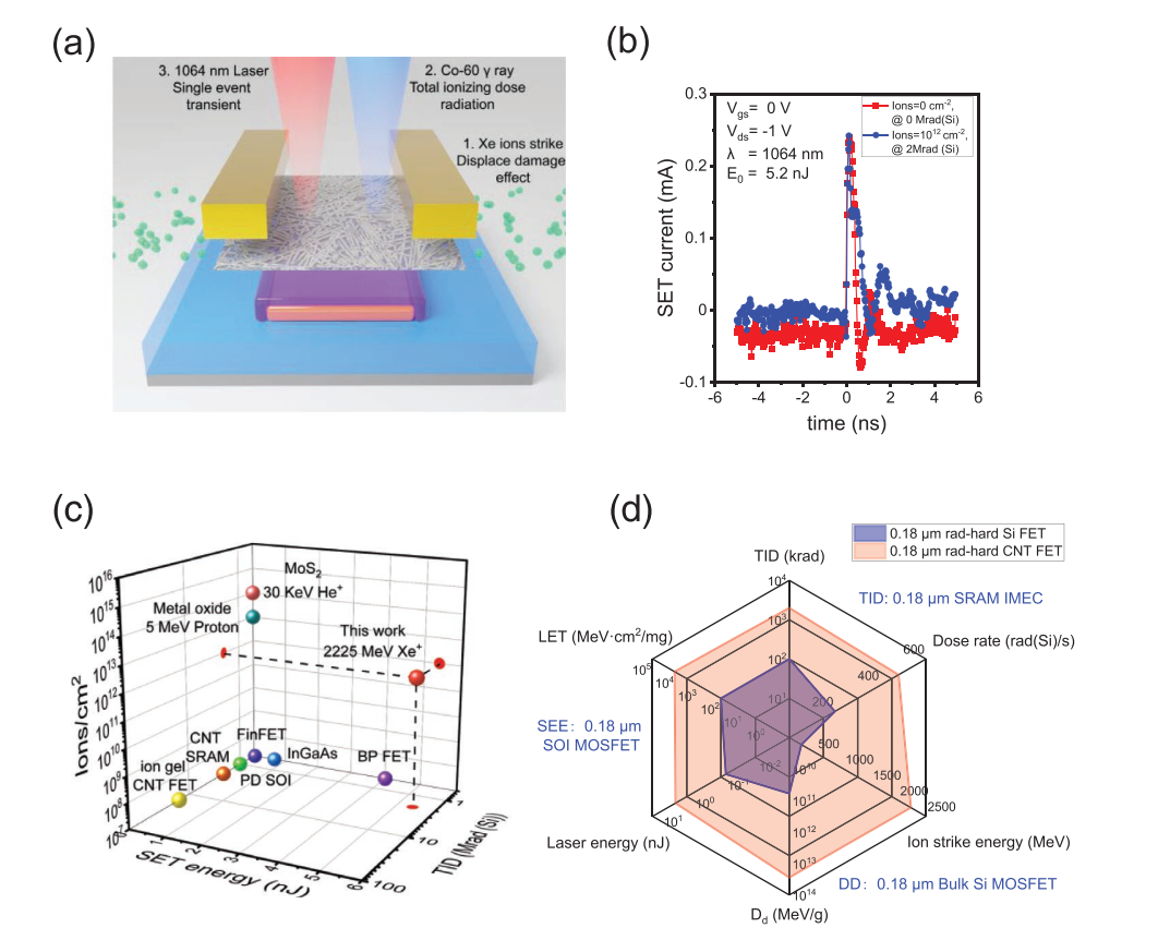 随着航天事业的飞速发展,载人登月和太阳系探测等新一代宇航任务对电子器件的性能提出了更高的要求,而空间中严酷的高能粒子-宇宙射线产生的电离总剂量、单粒子以及位移损伤复合辐照环境是宇航芯片面临的主要威胁。现有研究显示,碳基电子器件具备远超传统硅基器件的抗电离总剂量辐照能力,可满足深空探测任务对芯片寿命长达数年乃至数十年的需求,但是关于碳基器件单粒子效应、位移损伤效应以及复合辐照效应等的研究未见相关报道,因此我们难以系统评估碳基器件和集成电路的综合抗辐照能力。