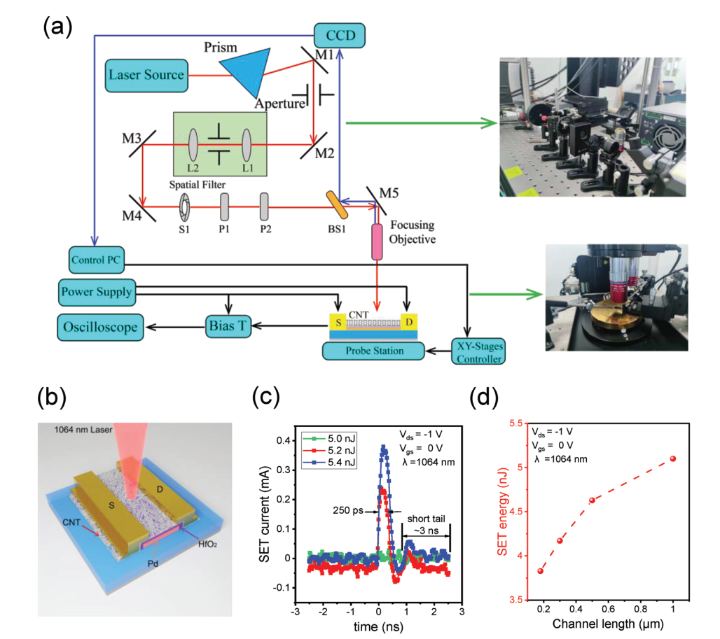碳基电子学研究中心、纳米器件物理与化学重点实验室张志勇课题组与中科院微电子所李博研究员、中科院国家空间科学中心陈睿副研究员合作,基于碳纳米管晶体管和静态随机存储器单元,利用激光辐照源测试碳基集成电路抗单粒子辐照能力,利用重离子辐照源测试碳基集成电路抗位移损伤能力,利用Co-60伽马射线源测试碳基集成电路抗电离总剂量辐照能力,系统揭示了碳纳米管场效应晶体管中的总剂量辐照、单粒子和位移损伤三种辐照损伤机理,探索了碳纳米管电子器件综合抗辐照效应能力。实验结果显示,所构建的碳纳米管晶体管和静态随机存储器电路可承受104MeV cm2mg-1等效激光单粒子辐照,2.8×1013MeV g-1的位移损伤辐照以及2 Mrad(Si)的电离总剂量辐照,其综合抗辐照能力优于硅基器件四倍以上,充分展示了碳纳米管电子器件在抗辐照领域的应用潜力。