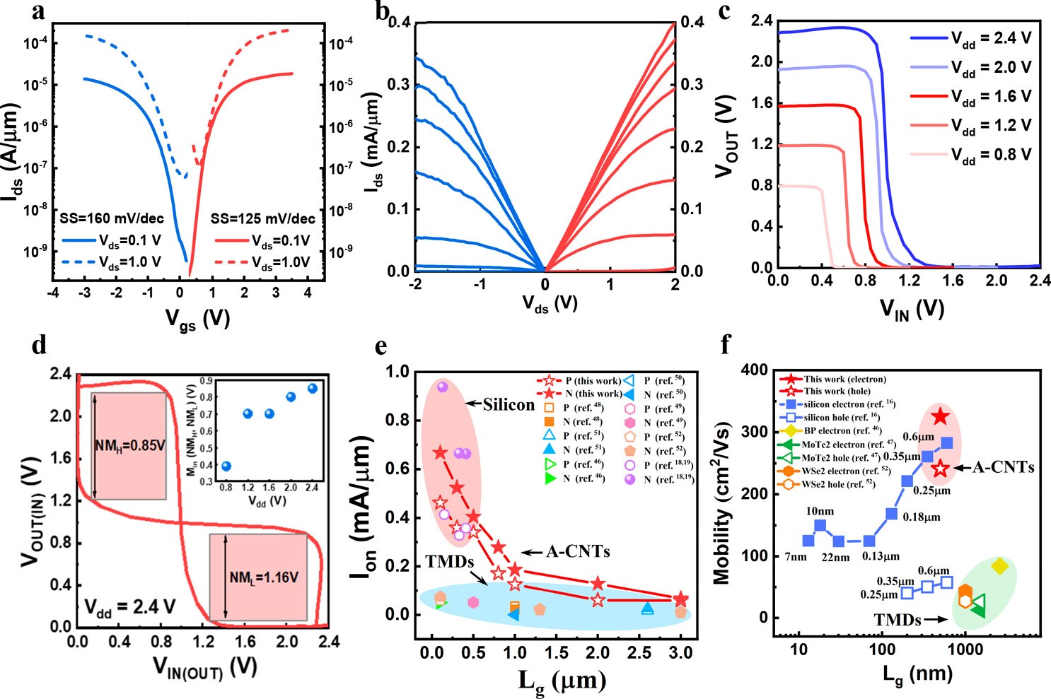 5:基于阵列碳管的CMOS器件与硅基和TMD器件的迁移率比较