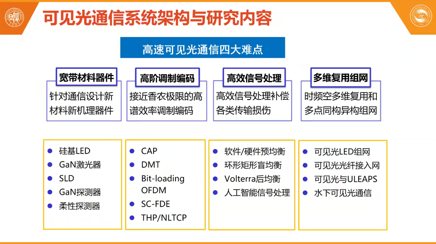 然后,迟教授就“可见光通信系统架构”介绍了她课题组的主要研究内容。针对可见光通信的发射器件方面,迟教授课题组在硅衬底上进行优化多层超晶格结构提升了带宽和信噪比,实现单芯片的功率达到瓦特量级,并且在1.2m实现了8波速率总和24Gbps,蓝光20m实现最快2.02Gbps。接着,迟教授介绍了在WDM高速RGB可见光通信方面,她们课题组实现了RGB三路谱效率可达5.86/5.456/4.98bit/s/Hz,实现了46.5Gbps的通信速率。在集成探测器方面,她们课题组还做了可见光的发射和调制的集成、发射和波导的集成、放大和波导的集成,波导和探测的集成等一系列工作。同时,迟教授介绍了柔性可见光通信的相关工作,在0.5m传输中,实现类纳米图案CPC形状LSC的400Mb/s速率的传输,以及与可穿戴设备集成来传输心电等信号。