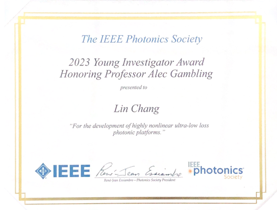 IEEE全称美国电子电气工程师学会(Institute of Electrical and Electronics Engineers),是全球最大的专业技术组织之一,致力于促进电气和电子工程领域的科学、技术和创新发展。其设立的奖项IEEE Photonics Society Young Investigator Award是光子学领域最为权威的面向青年科学家的奖项,每年颁发给一名在该领域做出杰出贡献的35岁以下的青年学者。