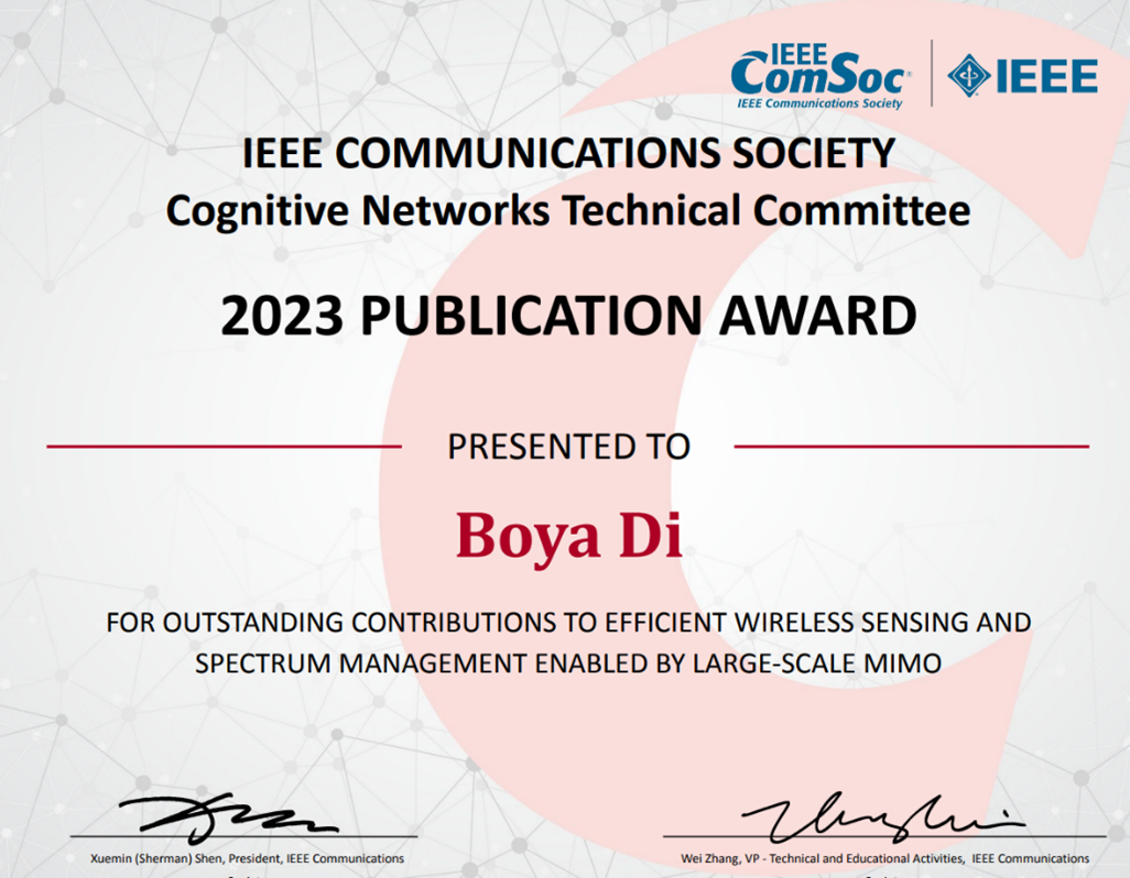 邸博雅助理教授与美国休斯顿大学Zhu Han教授共同获得2023年IEEE通信学会认知网络技术委员会论文贡献奖(IEEE Comsoc TCCN Publication Award),旨在表彰其在超大规模MIMO传输与频谱管理研究领域所做的杰出贡献。
