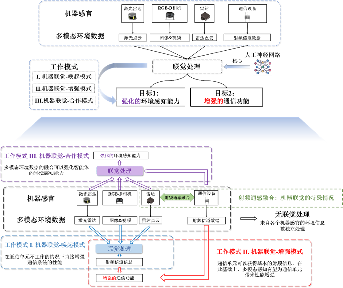 基于机器联觉概念,程翔教授团队通过定义机器联觉的三种工作模式,首次系统总结了通信与多模态感知之间相互辅助增强的范式,为通信与多模态感知智能融合领域提供了统一的设计目标与思路(图1)。其具体包括唤起模式、增强模式与合作模式:唤起模式是指在通信单元不工作的情况下直接增强通信系统的性能;增强模式是指通信单元在获得基本射频信息的基础上,利用多模态感知为通信单元带来性能增强;合作模式是通过多模态环境数据的融合强化智能体的环境感知能力。考虑多模态感知与通信之间的固有差异并受人类联觉中脑神经网络的启发,程翔教授团队指出人工神经网络是机器联觉的三种工作模式中的核心工具。与通常采用的数据驱动方式不同,SoM需要以模型增强数据驱动的方式应用人工神经网络,在分析、研究通信系统和感知系统特定任务的理论基础上,实现多模态感知与通信之间可信可解释的智能融合。