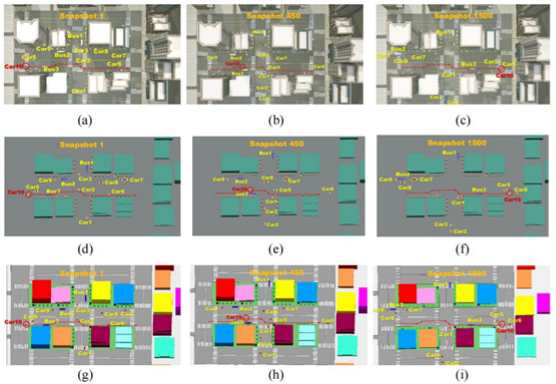 图1:高动态的城市十字路口场景。图(a)-(c)分别代表AirSim中第1帧、第450帧和第1500帧的场景;图(d)-(f)分别代表WaveFarer中第1帧、第450帧和第1500帧的场景;图(g)-(i)分别代表在Wireless InSite中第1帧、第450帧和第1500帧的场景