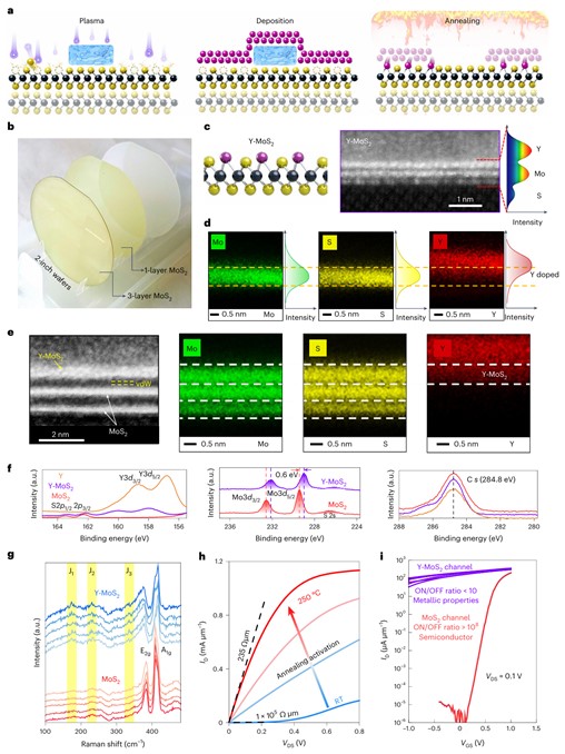 2.发明了“原子级可控精准掺杂技术”。设计了超低功率软等离子体-固态源活性金属沉积-真空退火的三步法原子级掺杂工艺,有效地将固态源掺杂剂钇原子扩散注入进精细图案化的二维接触区域表面,这种新型的接触掺杂策略可以兼容于1 nm技术节点的光刻工艺。