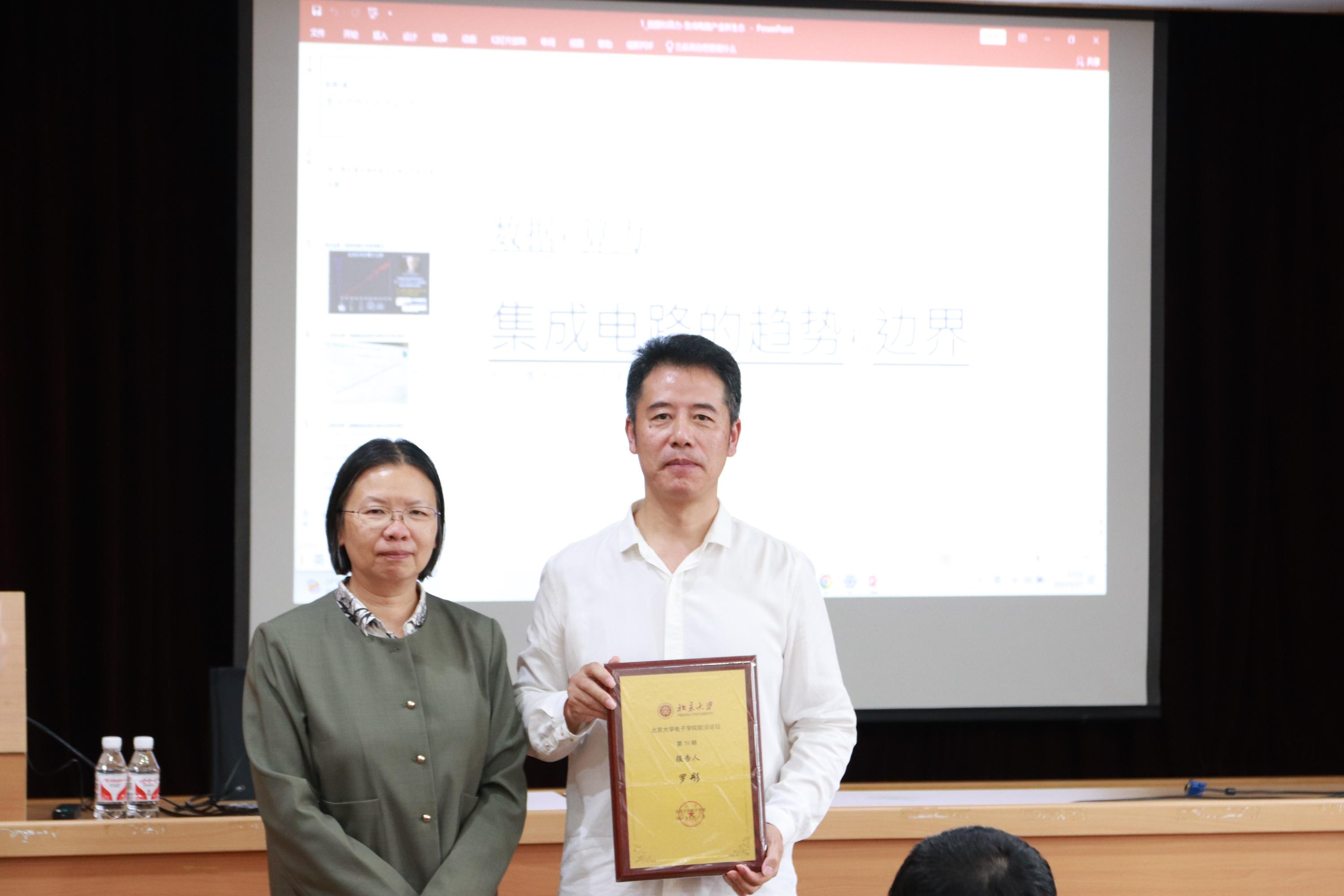 在互动环节,现场老师和同学们踊跃提问,罗总逐一解答。当谈到未来计算模式时,罗总指出未来算力系统将回归集中以应对芯片成本和算力能耗的急剧增长。当讨论到类脑计算和神经形态计算时,罗总认为这类新架构芯片在理论上具有显著先进性,而其应用和发展取决于目前计算科学具体专用领域的发展。最后,罗总寄语希望我们能够透过广义和狭义的摩尔定律看到本质,能够在未来科研和工作道路上长久稳定地进步发展,共同努力实现更大突破。报告结束时,18漫画 陈清教授为罗总颁发了18漫画 前沿论坛纪念牌,并合影留念。