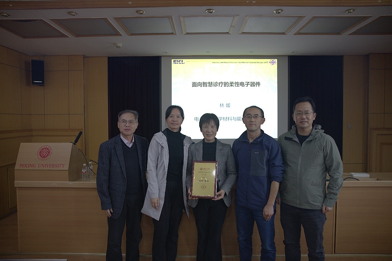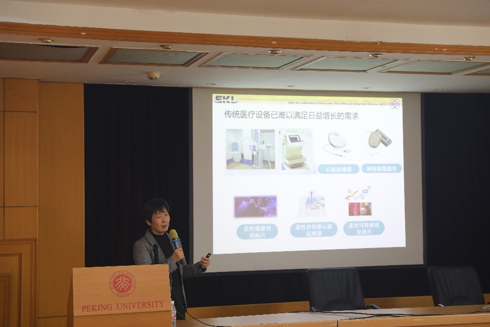 首先,林媛教授以疾病监测和治疗为背景,指出智慧医疗迫切需要适应人体组织的集成信息器件。柔性电子器件改变了电子器件传统的刚性形态,同时,具有可延展性的柔性电子器件能实现良好的贴附性,更加适应人体组织。林教授从材料设计和结构设计两个方面介绍了实现可延展柔性化的途径。无机器件通常具有出色的电学性能,林教授介绍了无机功能薄膜的柔性化工艺以及面临的挑战,并分享了其课题组在无机功能薄膜的大面积转印和多层柔性电子集成技术上的工作。