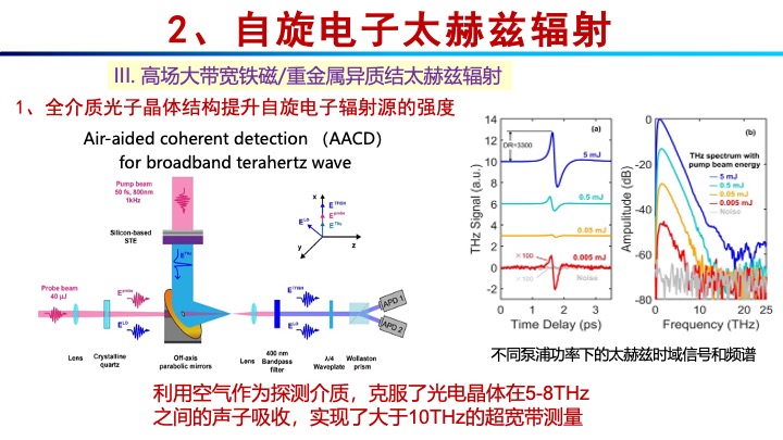 另外,为了提高铁磁/重金属薄膜异质结形成的太赫兹辐射的强度,获得高强度太赫兹辐射源,金教授团队与中物院团队合作,在自旋源中集成了全介质光子晶体结构,提高自旋源对飞秒激光的吸收率,从而提高自旋电子辐射源的发射功率。实验测量太赫兹峰值电场达到了1 MV/cm。为克服光电晶体在5-8 THz范围内的声子吸收,实验采用空气作为探测介质,从而实现了超过10 THz的超宽带测量。由于自旋源具有双向辐射的特性,通过调节前向和后向辐射的光程差,研究者实现了THz辐射波的相干合成。最终实验结果显示,合成场的场强比前向辐射电场强度提高了约1.5倍。