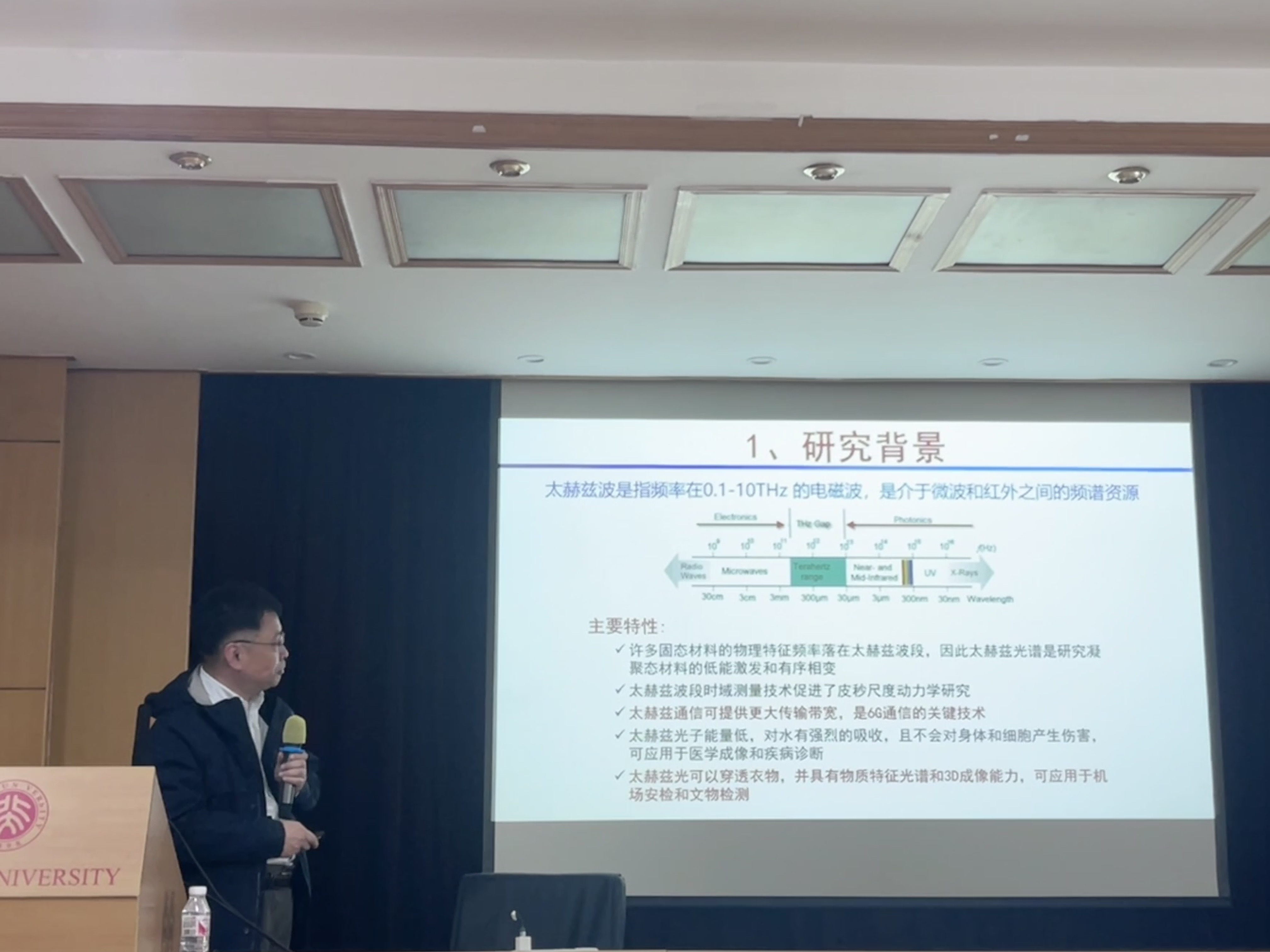 金教授首先介绍了太赫兹自旋电子学和太赫兹波束调控的研究背景。他从太赫兹波的特点出发,阐述了其在凝聚态物理研究和短程大容量通信中的应用。太赫兹自旋电子学作为自旋电子学和太赫兹光子学的交叉学科,为开发更低能耗、更高存储速度和更安全的电子学器件提供了新的研究手段,为信息存储技术的创新与突破提供了契机。另外,太赫兹通信技术凭借其更大的传输带宽,有望成为下一代短程无线通信的关键技术之一,尤其在通信与感知一体化方面展现出了重要的应用潜力。