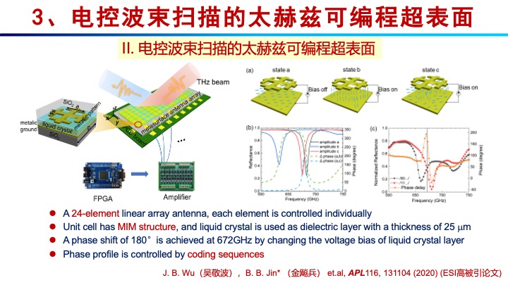 接下来,金教授介绍了团队在太赫兹可编程超表面方面的研究。传统的相控阵扫描天线存在系统复杂和成本高的问题,而且半导体器件在太赫兹波段性能下降很多。为了克服上述缺点,太赫兹可编程超表面成为实现高效太赫兹波束赋形的重要技术,也是实现电磁波感知与通信一体化的有效手段。金教授和他的团队利用液晶在THz频段的双折射效应,设计了一款电控波束扫描的太赫兹可编程超表面。该超表面由24列可独立操控的单元组成,通过改变液晶层的偏置电压,每个单元可实现180°的相位变化,这使得该结构的相位特征可以通过编码序列进行灵活操控。此外,通过引入交叉结构,单元所在行和列的地址分别由上层和接地层的电压差控制,这使得控制线的数量从2N减少到2N,显著降低了结构控制的复杂性,可以实现大阵列液晶可编程超表面,提高太赫兹天线的扫描覆盖范围。