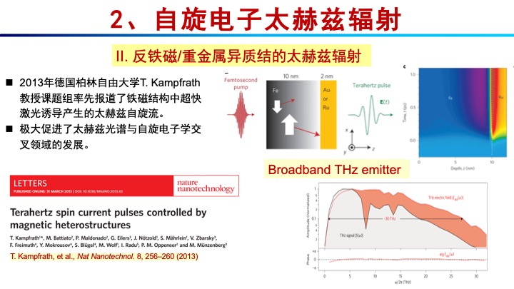 随后,金教授介绍了自旋电子学在太赫兹波段的一项引人注目的创新成果,即飞秒激光泵浦反铁磁/重金属薄膜异质结,产出超快自旋流。该自旋流从反铁磁薄膜中产生并扩散到重金属层中,依据逆自旋霍尔效应,该自旋流可转化为电荷流,并向由空间辐射出太赫兹波。反铁磁材料中超快自旋电流的产生为高速和高容量自旋电子学存储器件的发展开辟了新的路径。