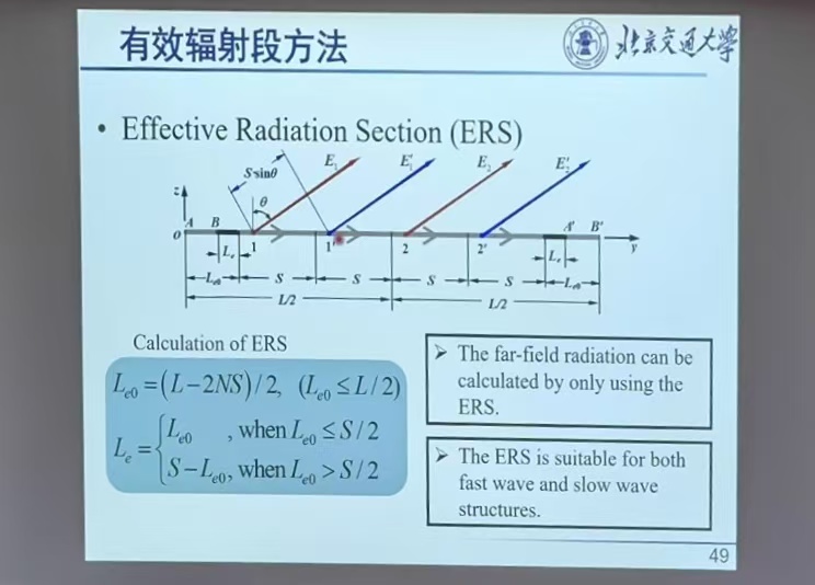 在第二部分,李教授介绍了基于有效辐射段方法的方向图综合方法。该方法指出,远场辐射仅受天线前后两端的有效辐射段影响。因此,通过调整有效辐射段的辐射特性,可以实现波束综合,用于实现低副瓣和零陷。有效辐射段分析方法同时适用于基模为快波的(准)均匀漏波天线和基模为慢波、辐射模式为高次空间谐波的周期性漏波天线。李教授通过两个实例分别阐述了不同结构漏波天线中有效辐射段的计算方法及其相应的波束综合方法。与传统方向图综合方法相比,该新方法具有显著优势:传统方法往往面临计算耗时长、结构参数与传输参数映射关系难以获取,以及交叉极化难以控制等问题。而基于有效辐射段的方法无需添加会产生交叉极化的结构,通过解析表达式即可实现方向图综合,具有计算简单快捷,交叉极化低,易于设计,易于加工的优点。