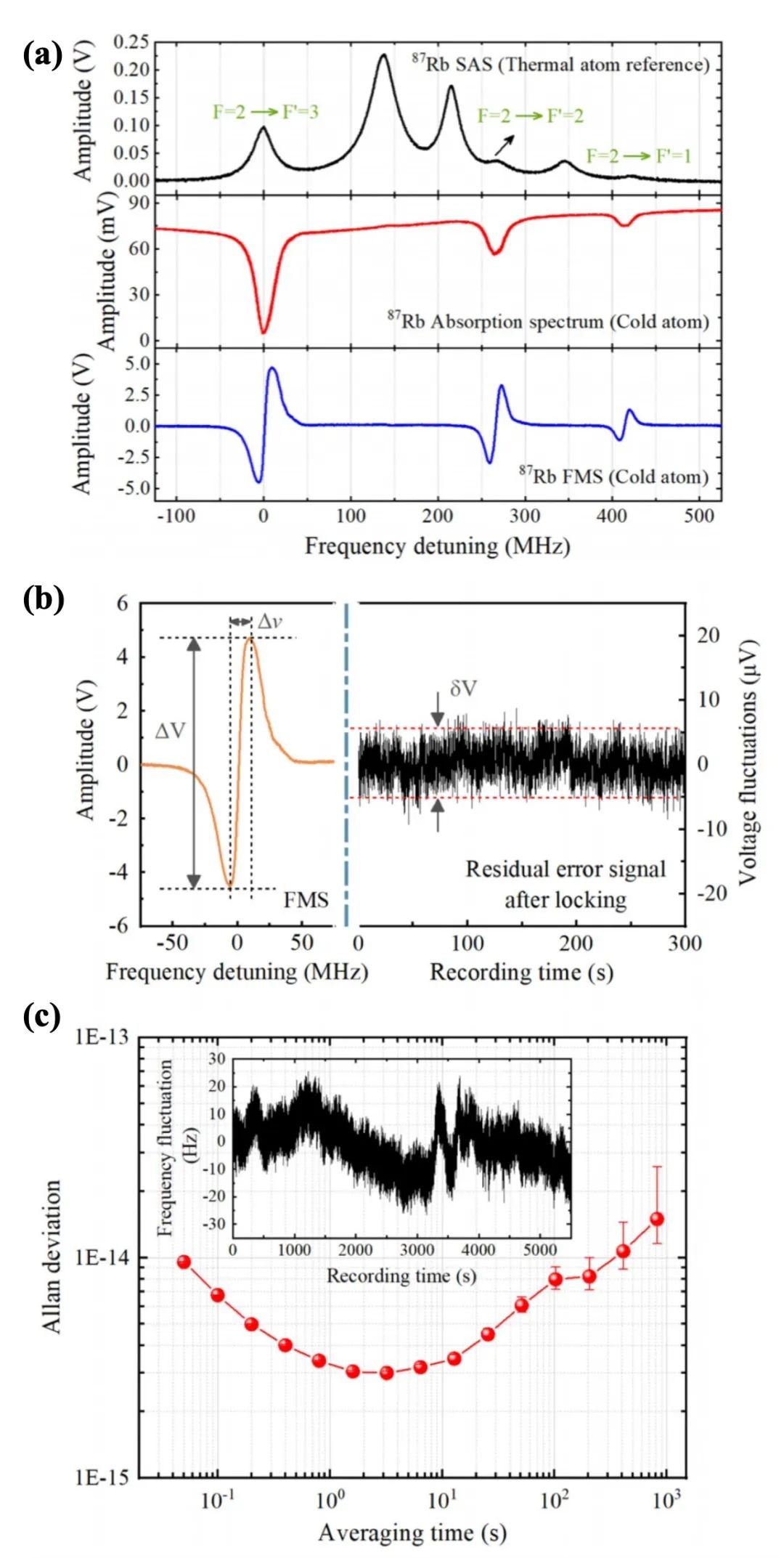 图4 冷原子频率调制谱探测(上)和780 nm冷原子光频标环内频率稳定度结果(下)