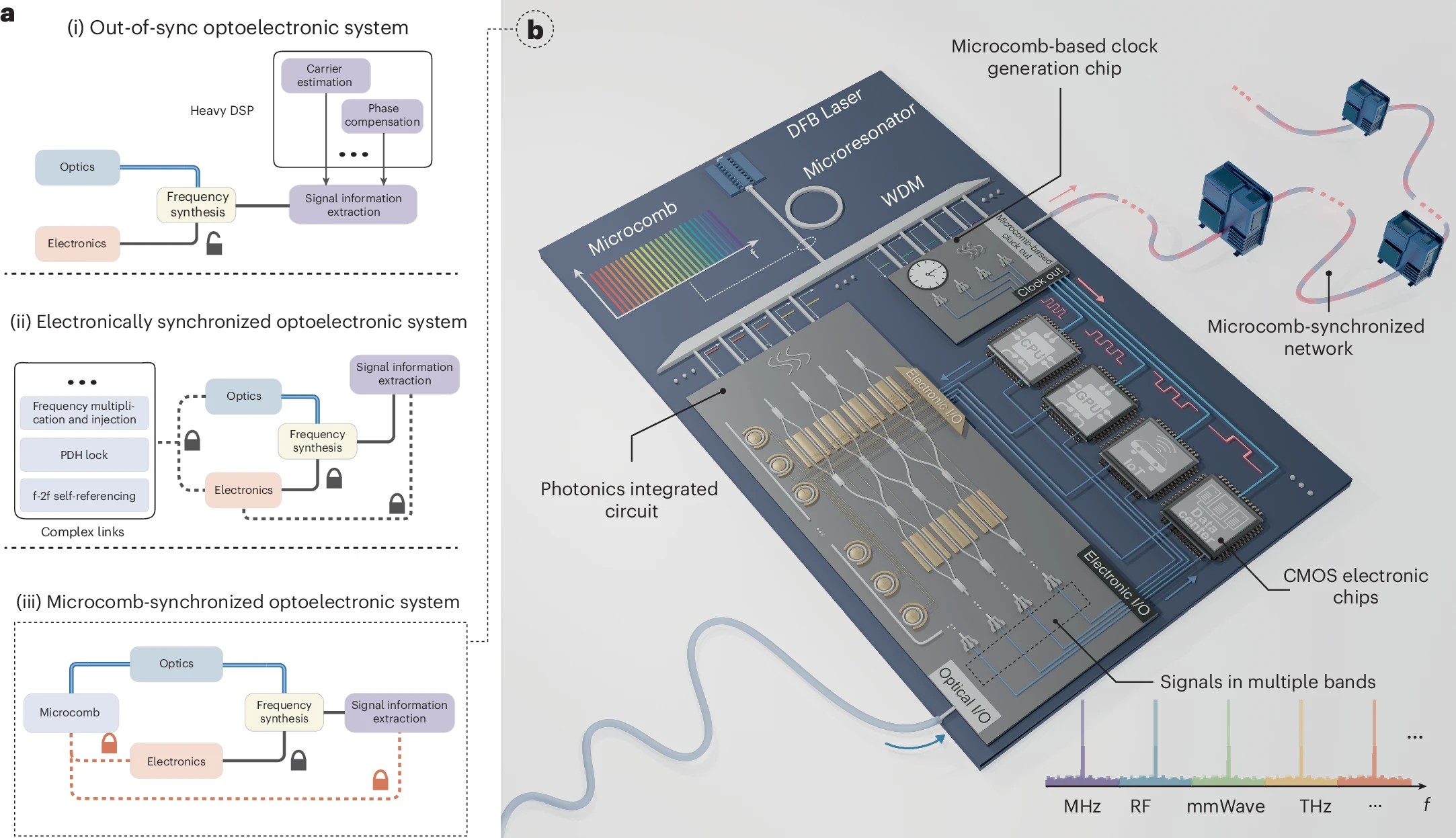 在当今信息时代,电子系统对高速与宽带性能的需求呈爆发式增长。传统电子技术生成高频信号时问题重重,带宽窄、信号易失真、功耗高。在光电子系统里,光学合成信号和电子时钟的频率严重不匹配,导致同步困难。这不仅降低处理精度,还减慢信息传输速度。虽然之前也有同步策略,可大多需要额外硬件和复杂操作,难以广泛应用。为攻克这些难题,研究团队联合研发出基于片上微梳的振荡器,用于光电子系统同步。该振荡器结合集成超高Q值谐振器的微梳和自注入锁定技术,能合成覆盖从兆赫兹到105 GHz的微波信号,给系统提供共享时频参考,让光学和电子信号自然同步。