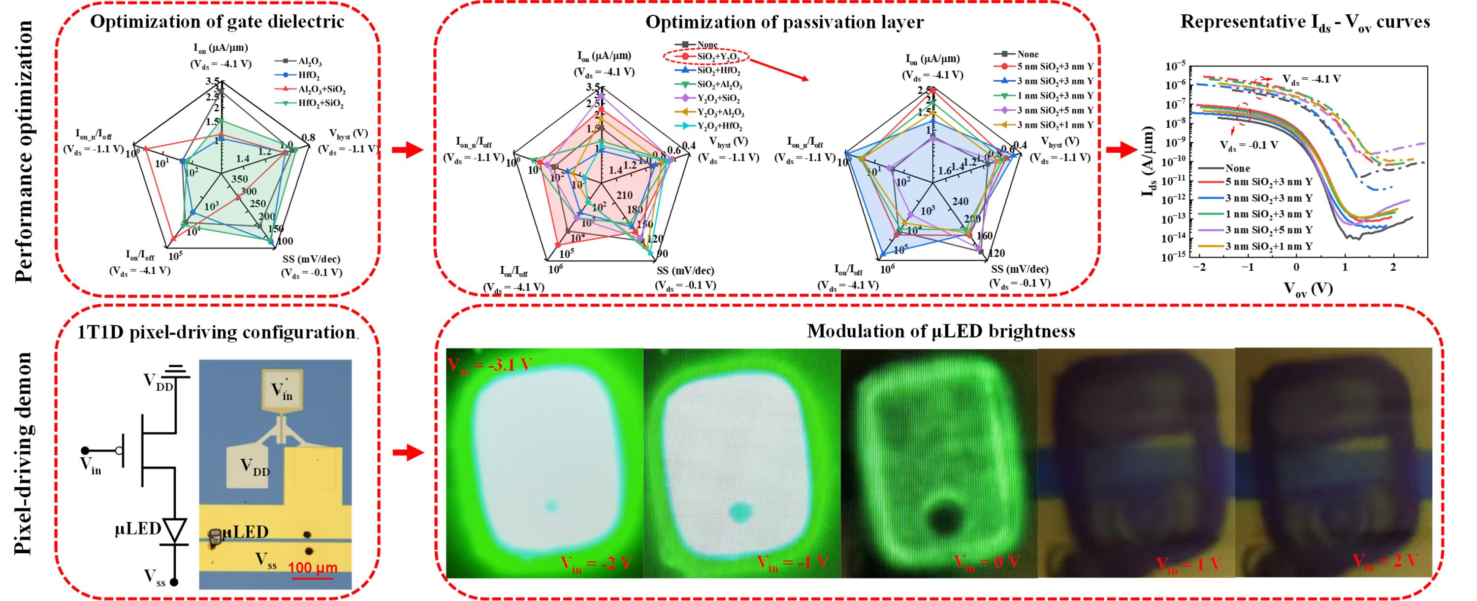 ∙山西碳基薄膜电子研究院研发团队联合成都辰显光电有限公司,通过优化CNT TFTs的栅介质层和钝化层,实现了针对显示驱动应用的性能指标综合优化。采用HfO2/SiO2叠层作栅介质、SiO2/Y2O3叠层作钝化层的CNT TFTs,10 μm沟道长度器件的平均Ion为1.2 μA/μm,在Vds为-0.1 V时,Ion/Ioff在Vds为-0.1 V和-4.1 V时分别超过106和105,SS低至180 mV/dec,Vhyst低至0.5 V,并且几乎没有双极性;2 μm沟道长度器件的平均Ion高达到16.4 μA/μm,代表了微米级沟道长度CNT TFTs最佳整体性能。基于这些优化的CNT TFTs,成功展现了对micro-LED像素的有效调制。