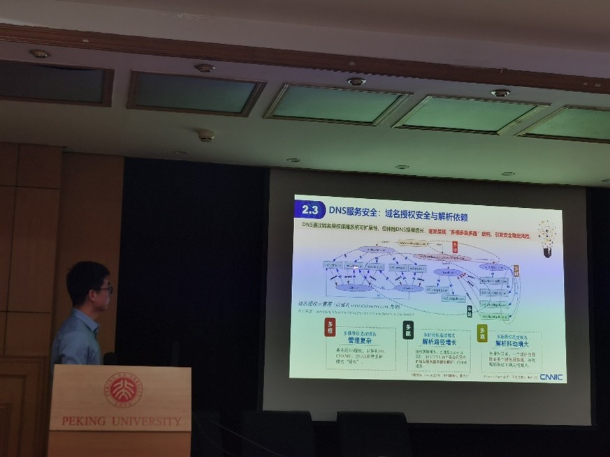 在介绍完域名的背景知识后,延主任讲解了DNS安全相关的知识。他首先列举了常见的典型域名滥用手段,包括网络钓鱼,仿冒政府网站,利用域名服务远程控制僵尸网络,以及批量投放有害垃圾邮件等。随后,他介绍由于DNS授权方式多样、解析路径较长,以及多路授权导致的解析抖动增加,DNS系统具有多模、多跳、多路的特征,这使得其具有评估难、预警难、验证难这三大难点。接着,延主任介绍了常见的DNS服务攻击方式,如DDoS攻击、反射放大攻击和域名劫持等。通过他的详细讲解,大家对DNS服务的攻击手法有了更深入的了解,进一步增强了防范意识。最后,延主任提到了DNS隐私安全问题,指出在DNS解析流程中,解析请求者的信息往往会被包含在内,从而带来了隐私泄露的风险。