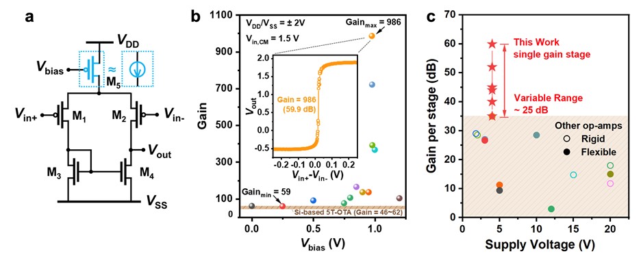 a,基于柔性碳基CMOS晶体管构建的五管运算放大器电路图,b,柔性碳基CMOS运算放大器在尾电流源管不同偏置状态下取得35dB-60dB的指数可调增益,c,与代表性工作对比。