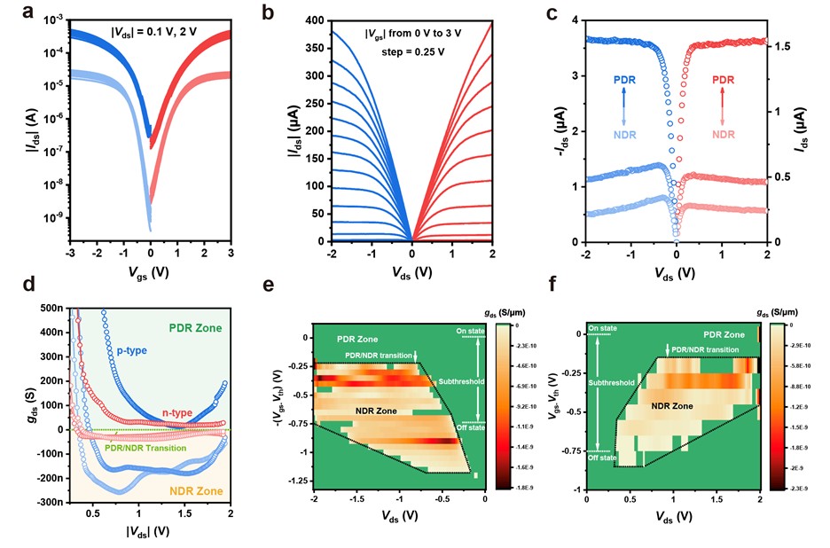 a-b,晶体管的转移与输出特性图,c-d,亚阈值区负-正微分电阻转变曲线与微分电导提取,e-f,晶体管的微分电导图,包含大面积的栅压可调NDR区域。