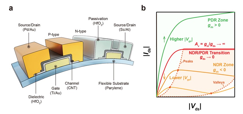 a,柔性碳基CMOS晶体管结构示意图,b,碳基CMOS晶体管的输出曲线示意图,包含亚阈值区的本征负微分电阻效应和电流超饱和现象。