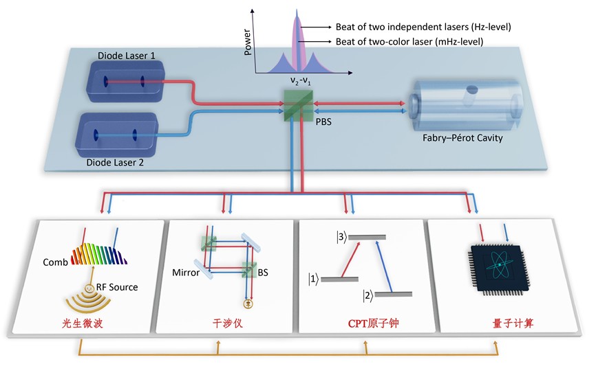 在研究高稳定高相干双波长激光器的过程中,团队掌握了下一代光钟所需的超稳激光锁定技术。除了本工作中用于光生微波的应用外,高相干双波长激光器还被期望应用于高精度干涉仪、CPT原子钟和量子计算等领域。