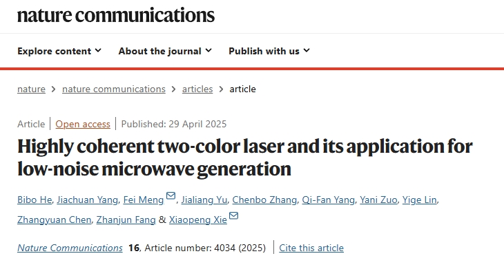 物理学院等团队密切合作,提出了一种基于高相干双波长激光器与电光梳的双点分频法方案,探索了该系统的噪声极限,并取得了纪录性的成果,解决了传统方案在结构复杂性方面的难题。2025年4月29日,相关研究成果以“高相干双波长激光器及其在低噪声微波产生中的应用”(Highly coherent two-color laser and its application for low-noise microwave generation)为题,在线发表于《自然·通讯》(Nature Communications)。