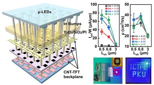 碳基电子学研究团队联合山西北大碳基薄膜电子研究院和南京大学,开发CNT-TFT驱动的Micro-LED微显示技术,通过引入Al2O3/SiO2栅介质叠层以及Y2O3/SiO2/PI钝化层,优化了CNT-TFTs的电学性能。采用通常紫外光刻制备的沟道长度3μm的CNT-TFTs开态电流达10μA/μm,迁移率达27cm2/(V∙s),可用于数百PPI(pixel per inch)分辨率的Micro-LED显示驱动;沟道长度的0.5μm器件开态电流达到80μA/μm、迁移率达到40cm2/(V∙s),可实现数千PPI分辨率的Micro-LED微显示。研究团队利用一种基于铟柱的共晶键合工艺,实现了2T1C CNT-TFT驱动背板和Micro-LED芯片的异质集成,键合成功率可达100%。团队开发了针对CNT-TFT驱动背板的像素驱动电路和外围控制电路,能够支持脉冲幅度调制(PAM)和脉冲宽度调制(PWM)两种驱动方式,成功制备并演示了首个碳纳米管有源矩阵背板驱动的Micro-LED微显示器,可实现静态和动态图像显示,被审稿人评价为“迄今为止展示的性能最强的碳纳米管驱动的LED显示器”,展示了碳纳米管在先进显示驱动技术中的应用潜力。