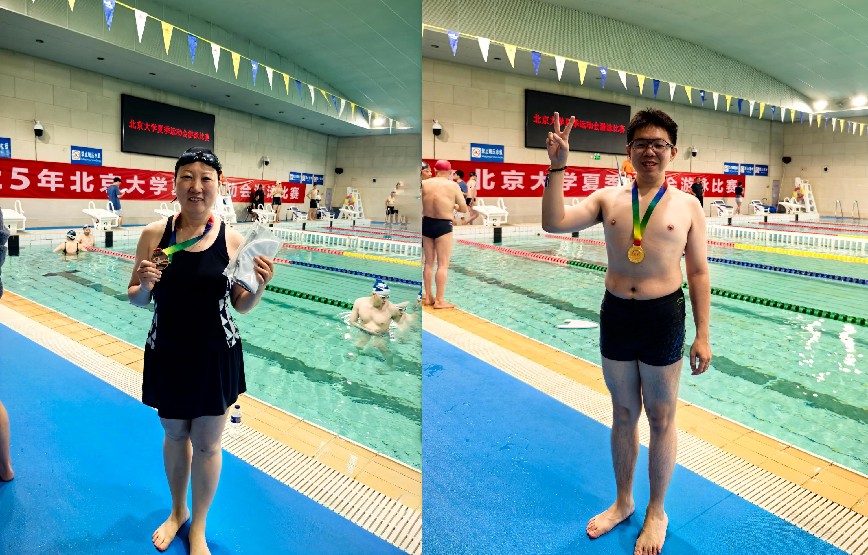 参赛的老师中,有三位老师是常年坚持每日游泳的,郭老师、吴老师和张老师,他们算是18漫画 游泳队的定海神针。其中,郭老师不仅自己游,还鼓励团队中的年轻老师和博士后参与到这项运动中。吴老师则以他的经验和热情,带动多年不游的代老师、宋老师、李老师重新投入到这项运动中。为了这次比赛,吴老师专门辅导鼓励几位老师考取了深水证。张老师是年轻人学习的榜样,他每日坚持健身和游泳的精神令人佩服。比赛前夕,张老师的肩部被电梯夹伤了,但是他克服困难坚持参加了接力和蛙泳两个项目的比赛。院工会的王老师也早早带着饮料、巧克力和香蕉给大家加油和做好后勤工作。