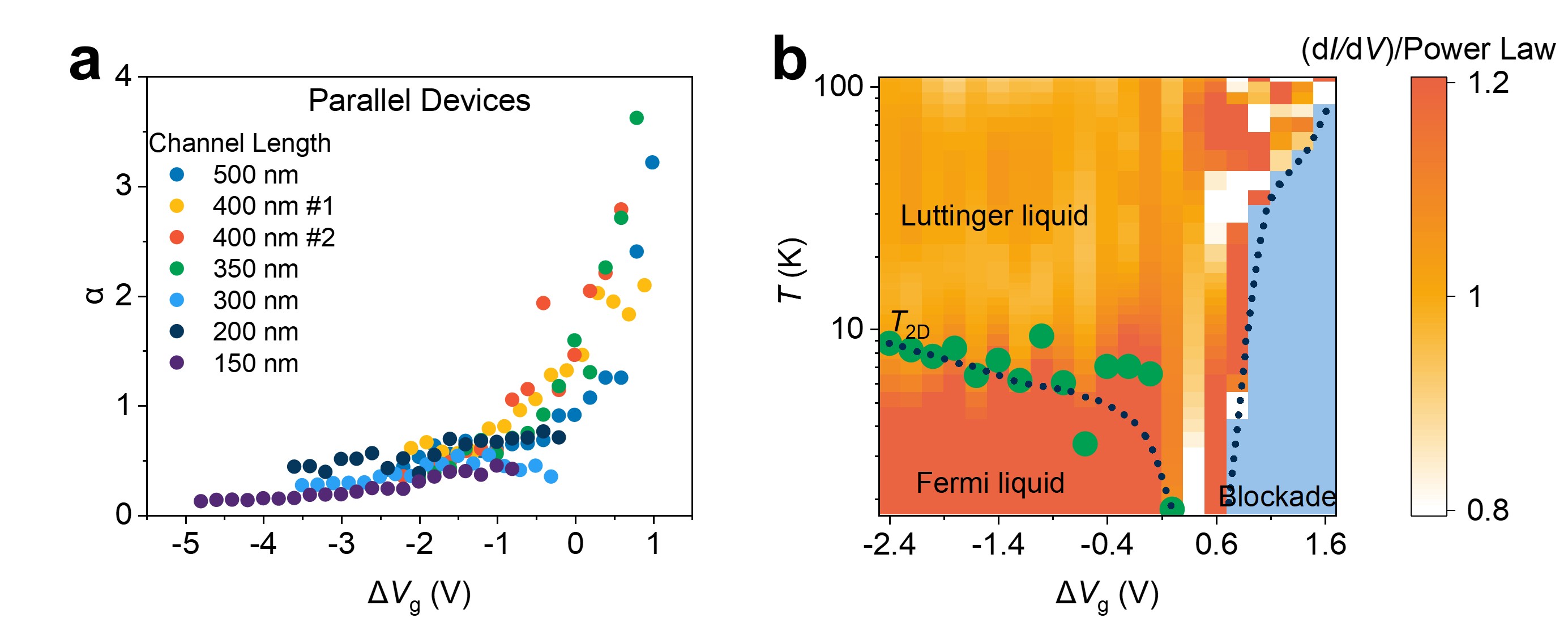图3 高密度碳纳米管阵列可调电子关联效应。a,多个器件中幂律指数随栅压的统一调制规律;b,归一化微分电导的栅压和温度分布图,幂律行为的偏离展示出清晰的量子态区间。