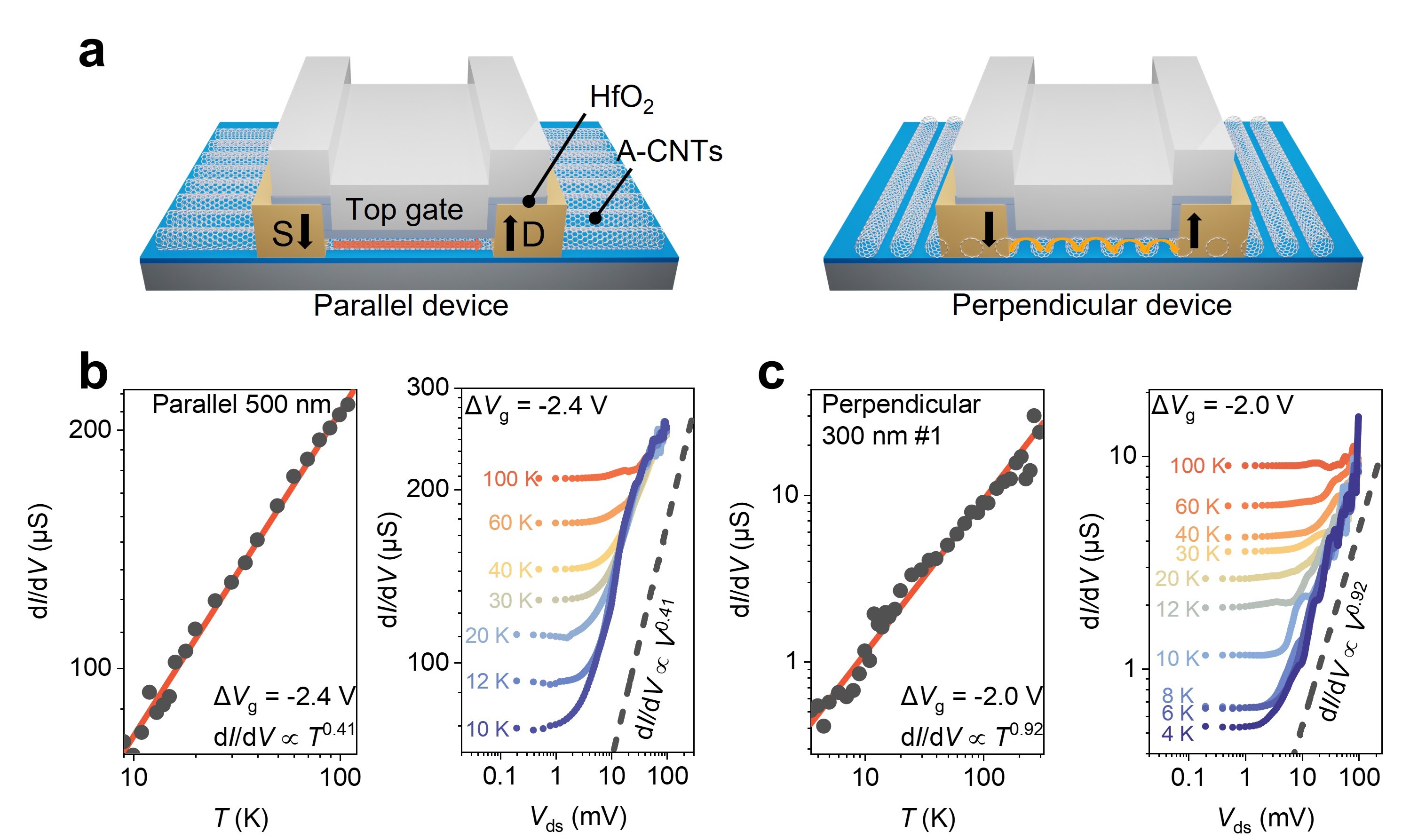 图2 高密度碳纳米管阵列的Luttinger liquid行为。a,基于碳纳米管阵列的平行与垂直器件结构示意图;平行(b)和垂直(c)器件的微分电导随温度和偏压的幂律标度行为。