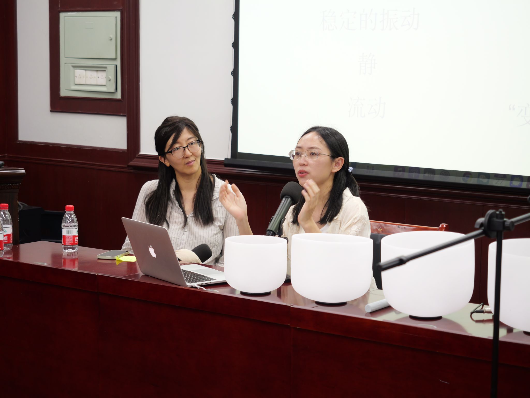 在“音乐疗愈是什么”部分,籍老师围绕“稳定的振动、静与流动、沟通与自然、变中的不变”等核心概念,勾勒音乐疗愈的内在逻辑框架;强调通过有意识的声响与倾听,协助个体在变化的境遇中重获稳定的内在节律。籍老师通过现场演奏水晶钵与参与式练习,引导听众以呼吸为锚点,观察情绪的来去,并以自身声音为媒介体验“由声入心”的安宁路径。