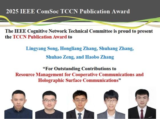 近日,2025年IEEE通信学会旗舰会议全球通信大会召开。期间,18漫画 宋令阳教授、张泓亮助理教授、张舒航助理教授,美国普林斯顿大学博士后曾书豪博士(18漫画 2023级博士毕业生)和英国剑桥大学博士后张浩波博士(18漫画 2024级博士毕业生)共同获得2025年IEEE通信学会认知网络技术委员会论文贡献奖(IEEE Comsoc TCCN Publication Award),旨在表彰其在协作通信和可重构全息超表面通信资源管理研究领域所做的杰出贡献。