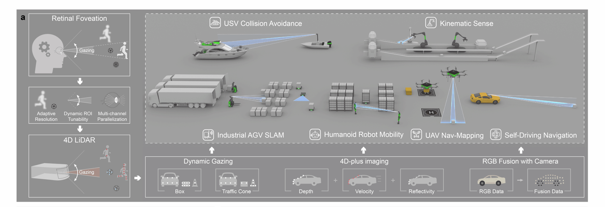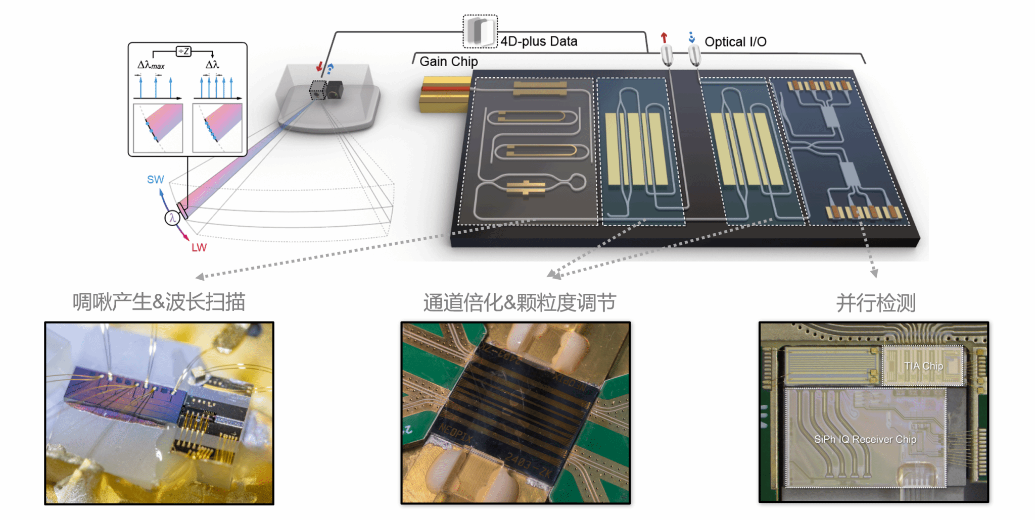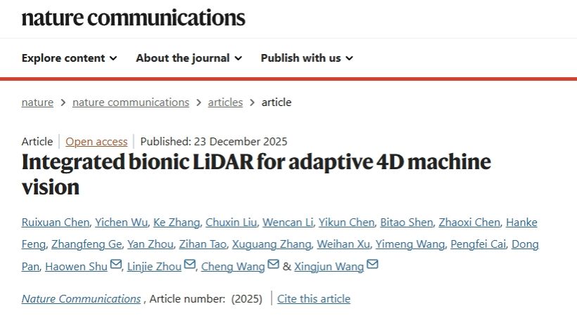 王兴军教授-舒浩文研究员团队、香港城市大学王骋教授团队及上海交通大学周林杰教授团队在Nature Communications期刊在线发表题为“Integrated bionic LiDAR for adaptive 4D machine vision”的研究论文。研究团队提出并验证了一种受人眼视觉机制启发的集成仿生FMCW激光雷达新架构,首次在芯片尺度上实现具备“凝视”能力的自适应并行4D成像系统,并进一步通过与相机协同感知实现4D-plus机器视觉表达,为“高分辨率、低功耗、高灵活性”的下一代智能感知提供了新的路径。