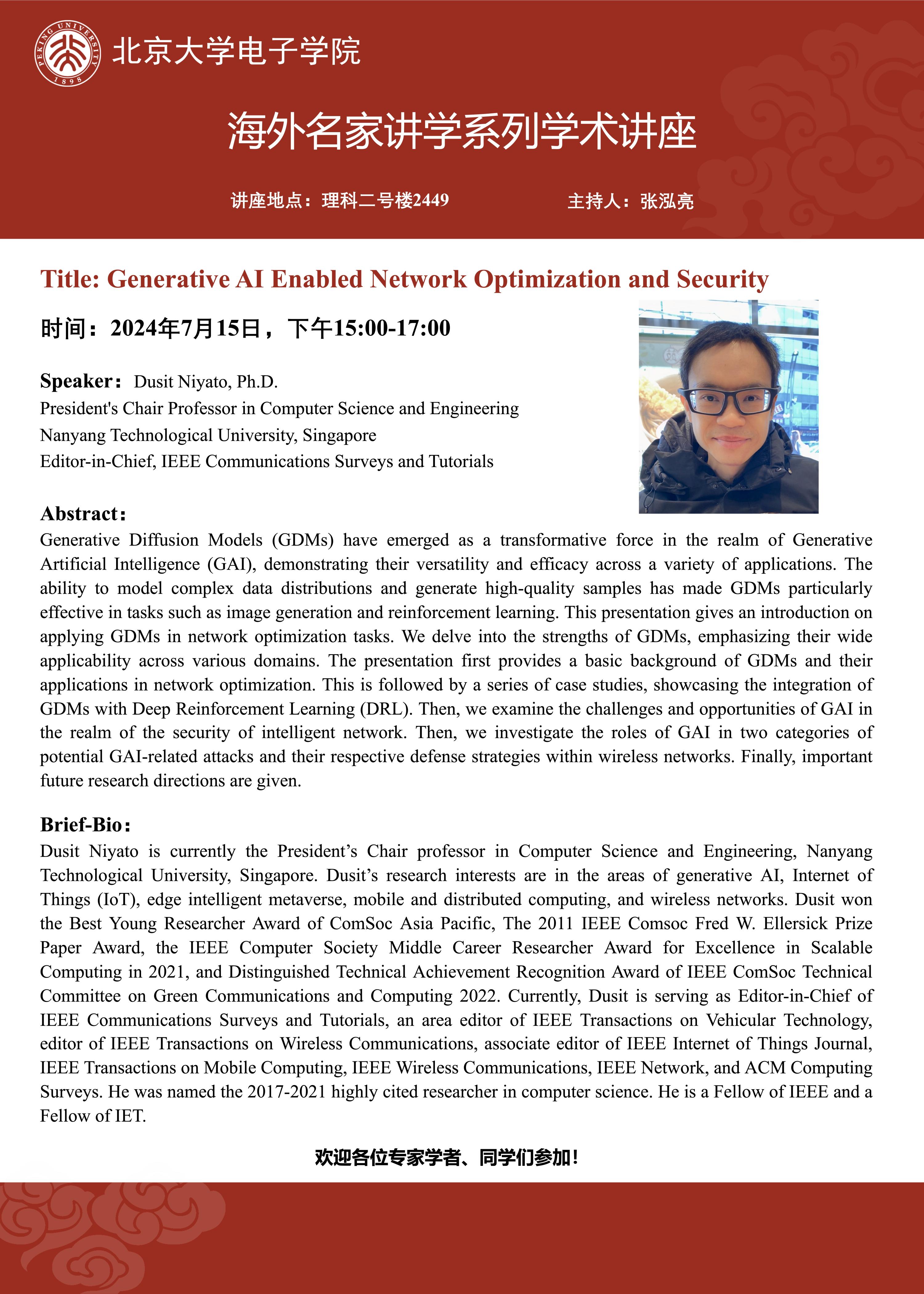 Dusit Niyato,现任新加坡南洋理工大学计算机科学与工程学院校长讲席教授,IEEE Fellow和IET Fellow。他的研究方向包括生成式人工智能、物联网、边缘智能元宇宙、移动和分布式计算以及无线网络等,获得多项学术奖项与基金荣誉,包括IEEE通信学会亚太地区最佳青年研究员奖、2011年IEEE通信学会Fred W. Ellersick论文奖、2022年IEEE ComSoc绿色通信与计算技术委员会杰出技术成就奖等奖项。目前,他担任IEEE通信领域影响因子最高期刊IEEE Communications Surveys and Tutorials主编,IEEE Transactions on Vehicular Technology领域编委,IEEE Transactions on Wireless Communications、IEEE Internet of Things Journal、IEEE Transactions on Mobile Computing、IEEE Wireless Communications、IEEE Network和ACM Computing Surveys等期刊编委。连续多年被评为计算机科学领域的科睿唯安全球高被引学者。