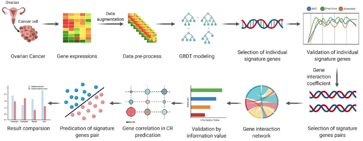 第三医院妇产科郭红燕教授与澳大利亚新南威尔士大学、英国剑桥大学、美国杜克大学的研究人员合作,在基于机器学习辅助的人类卵巢癌耐药性预测方法研究领域取得重要进展。在该研究中,考虑到过往研究中存在基因维度过高导致基因相互作用网络非常复杂而难以理解,研究人员首先构建了一个基于梯度提升决策树的机器学习模型来选取标志基因。进而,研究人员提出了基因相互作用系数来定量衡量两个标志基因的相关性,并以此建立卵巢癌耐药性的基因相互作用网络。最后,研究人员提出了一种基于标志基因对的卵巢癌耐药性预测方法。