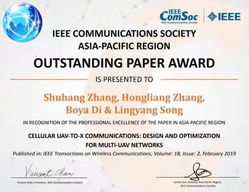 宋令阳教授、邸博雅助理教授团队发表在IEEE Transactions on Wireless Communications的论文“Cellular UAV-to-X Communications: Design and Optimization for Multi-UAV Networks”获得IEEE通信学会2021年亚太地区杰出论文奖。