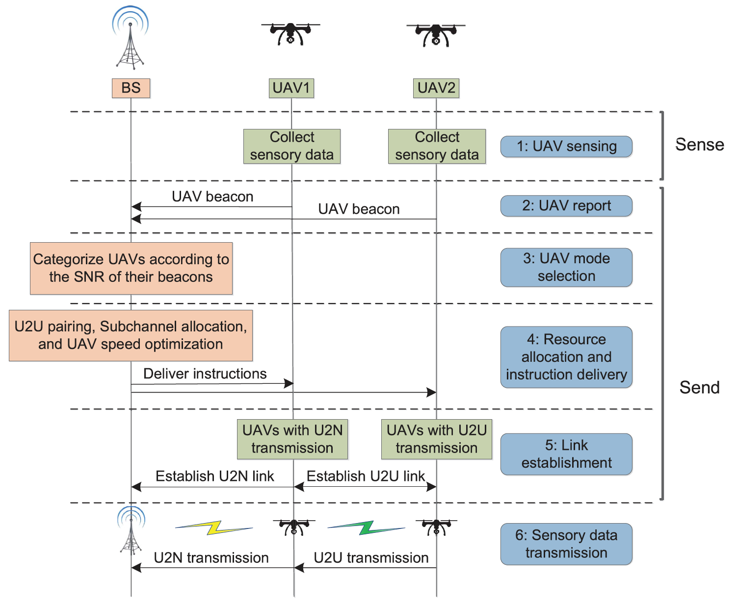 课题组通过联合优化控制无人机的运行轨迹与速度、通信资源管理、时序数据处理,并进行协作感知与通信协议设计(如图2),以支持无人机的多模式通信与感知任务。相关研究涉及无人机的轨迹优化控制、通信协议设计、感知数据传输与处理等方面,融合了多个学科领域如无线通信、信号处理、传感技术等方面的知识,并结合控制理论、优化论等理论方法,形成了一套学科交叉融合的研究方法,对于现实物联网中无人机的部署具有显著的指导性意义。