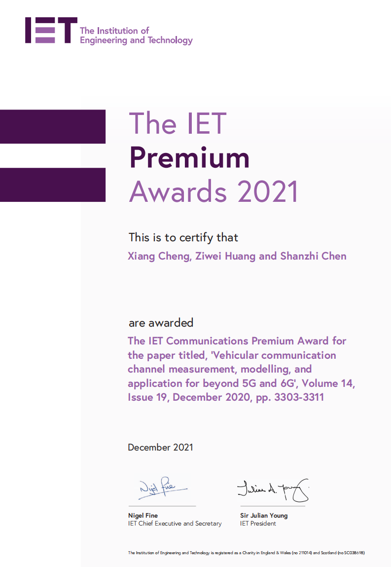 IET(The Institution of Engineering and Technology)是欧洲规模最大、全球第二的国际专业学会。IET Communications期刊是IET学会下属的通信领域权威期刊,也是SCI索引期刊,该期刊每年从过去两年内发表的所有论文中择优评选出唯一一篇论文作为期刊最佳论文奖,获奖率小于0.1%,是通信领域最重要的国际学术奖项之一。