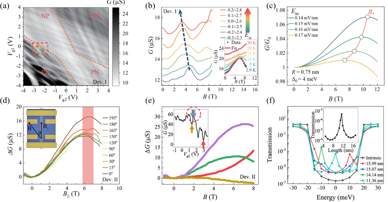 、碳基电子学研究中心、纳米器件物理与化学教育部重点实验室的张志勇、康宁课题组,与鸿之微科技有限责任公司王音团队和清华大学物理系姜开利课题组合作,在碳纳米管的量子相干输运研究方向取得进展:首次实现了内建电场调控的量子干涉效应,进一步在低磁场区域观察到法布里-珀罗(FP)干涉增强的AB效应。研究团队通过构建在片的成对侧栅结构,实现了对单根碳纳米管p-n结强度的有效调控,获得了工作在弹道输运区间的高质量碳纳米管器件(图1)。实验通过将器件工作区间稳定在双栅谱中的p-n边界处,在沿着内建电场增强的方向上成功观察到了特征的非单调磁输运行为,与理论预言的图像一致(图2a-c)。通过低温不同倾角下磁输运的演化行为进一步证实了磁导的AB来源(图2b和图2d)。实验首次观察到这种非单调的磁输运行为在FP的共振区域得到了极大的增强(图2e),基于非平衡格林函数和密度泛函的计算方法进一步显示了共振调制的透射系数行为(图2f)。该工作为一维电子体系中研究量子干涉效应,发展多场调控手段提供了新的方案。